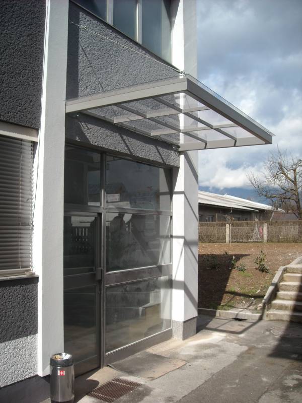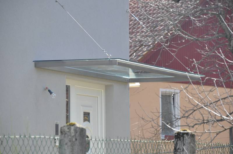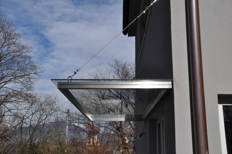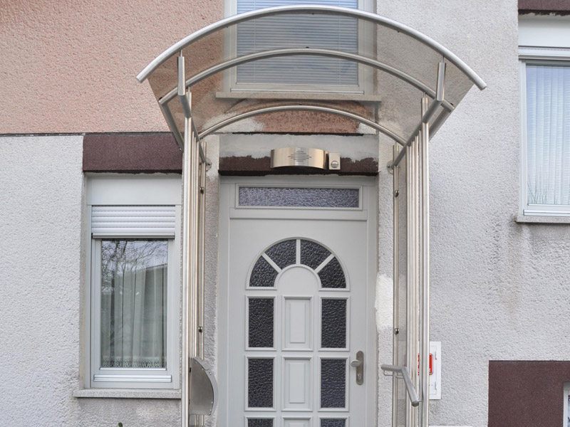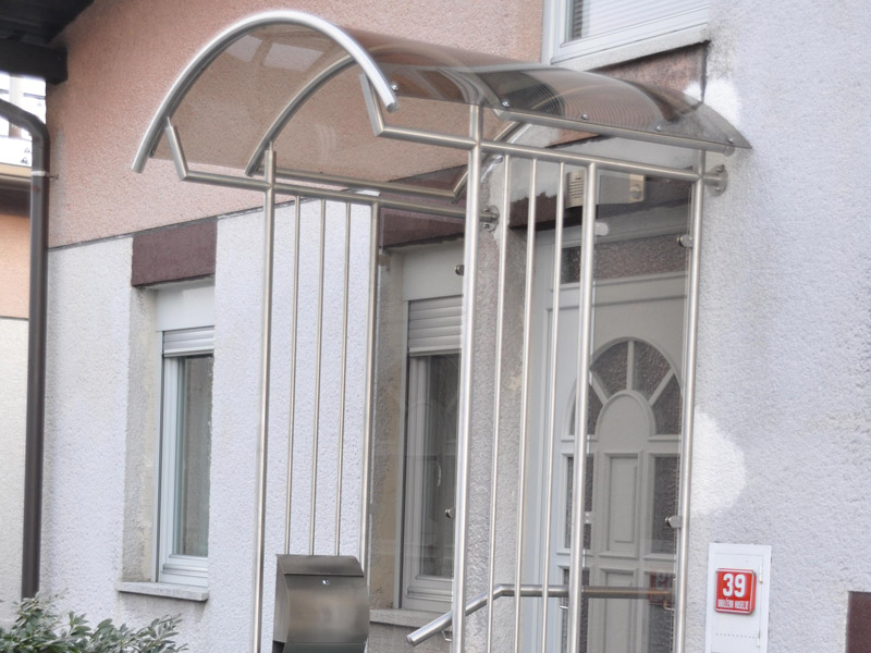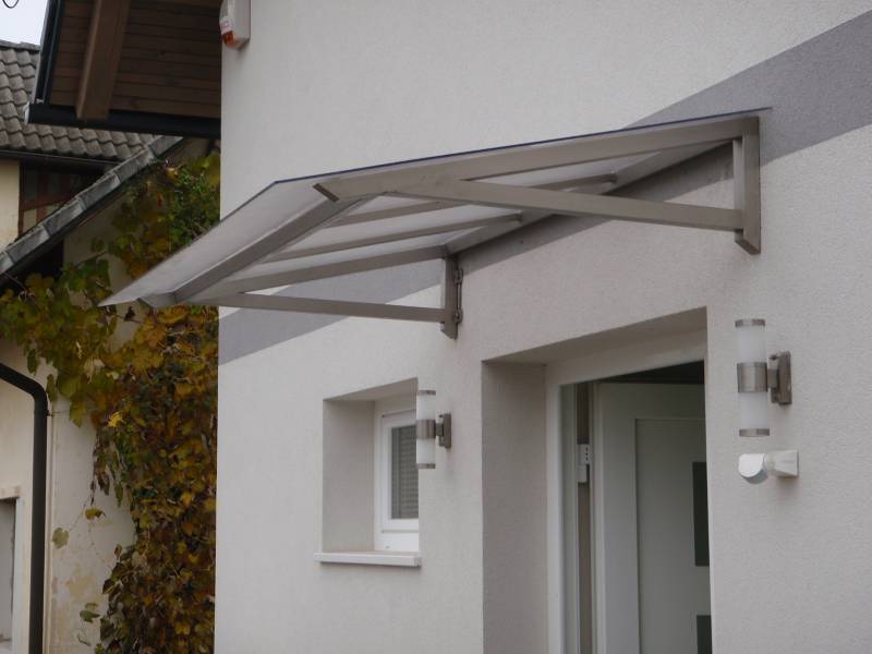 Edelstahlvordächer Sie sind gewöhnlich in der Kombination mit dem Plexiglas oder mit dem gehärteten Glas gefertigt, dabei ist aber der Tragaufbau etwas robuster und stärker, denn er muss witterungsbeständig sein (auch gegen den Hagelschlag). Die Vordächer sind frei stehend (Autoüberdachungen) oder auf ein vorhandenes Element (das Haus) befestigt.